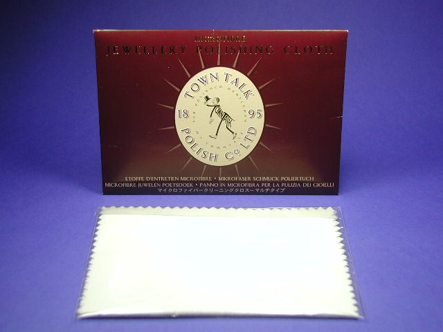 | Town Talk Polish社のマイクロファイバークリーニングクロスは指紋や油膜、細かいホコリや汚れ、ミクロの微粒子を綺麗にふき取ります。 金、プラチナ製品、銀製品、真珠、メッキ付き製品、ガラス製品など万能のクリーナーです。汚れましたら中性洗剤で洗ってください。 (サイズ:125ミリ×175ミリ) |